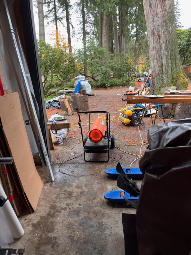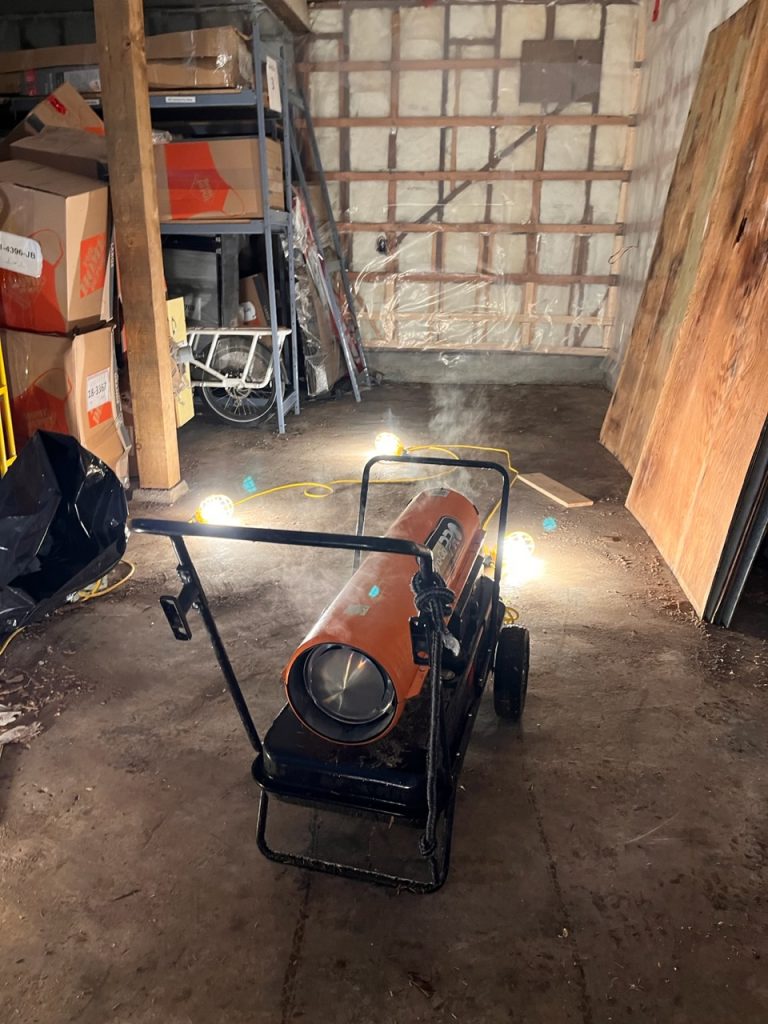 Weil es draußen so kalt war mussten wir die Garage aufwärmen. Damit die Farbe gut trocknet oder so. Also haben wir uns die Dieselkanone geschnappt und erstmal ein bisschen Panik bekommen.
